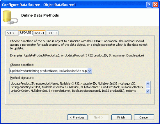 Es posible que haya observado que las listas desplegables de las pestañas UPDATE, INSERT y DELETE ya tenían estos métodos seleccionados. Esto es gracias al uso de DataObjectMethodAttribute que decora los métodos de ProductsBLL. Por ejemplo, el método DeleteProduct tiene la siguiente firma: