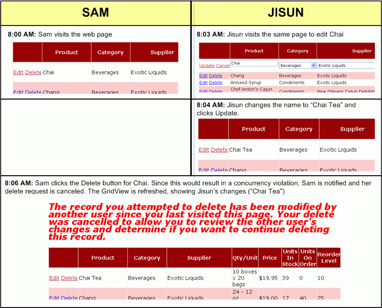 Por ejemplo, imagine que dos usuarios, Jisun y Sam, estaban visitando una página en nuestra aplicación que permitía a los visitantes actualizar y eliminar los productos a través de un control GridView. Ambos hacen clic en el botón Editar de GridView aproximadamente al mismo tiempo. Jisun cambia el nombre del producto a "Chai Tea" y hace clic en el botón Actualizar. El resultado neto es una UPDATE instrucción que se envía a la base de datos, que establece todos los campos actualizables del producto (aunque Jisun solo ha actualizado un campo, ProductName). En este momento, la base de datos tiene los valores "Chai Tea", la categoría Bebidas, el proveedor Exotic Liquids, y así sucesivamente para este producto en particular. Sin embargo, la GridView en la pantalla de Sam todavía muestra el nombre del producto en la fila GridView editable como "Chai". Unos segundos después de confirmar los cambios de Jisun, Sam actualiza la categoría a Condiments y hace clic en Actualizar. Esto da como resultado una UPDATE instrucción enviada a la base de datos que establece el nombre del producto en "Chai", el CategoryID al identificador de la categoría de Bebidas correspondiente, etc. Los cambios de Jisun en el nombre del producto han sido reemplazados. En la figura 1 se muestra gráficamente esta serie de eventos.