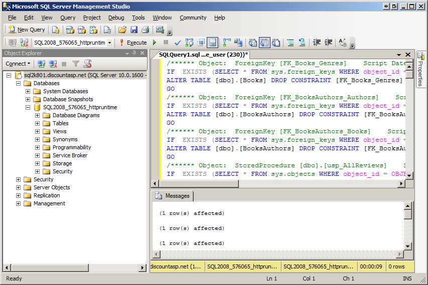 Ahora que tenemos el script que contiene los comandos SQL para crear la base de datos y sus datos solo queda ejecutar el script en la base de datos de producción. Algunos proveedores de host web ofrecen un cuadro de texto en su Panel de control donde puede escribir comandos SQL para ejecutarse en la base de datos. Si tiene un archivo de script muy grande, es posible que esta opción no funcione (el archivo de script de REVIEWS.MDF.sql tiene un tamaño de más de 425 KB, por ejemplo).