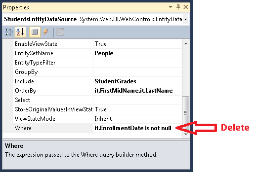 Abra la página Students.aspx. En el StudentsEntityDataSource control, quite el Where atributo y agregue un EntityTypeFilter="Student" atributo. El marcado será ahora similar al ejemplo siguiente: