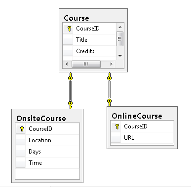 En el caso de los cursos, la School base de datos usa un patrón diferente. Los cursos en línea y los cursos in situ se almacenan en tablas independientes, cada una de las cuales tiene una clave externa que apunta a la Course tabla. La información común a ambos tipos de curso solo se almacena en la Course tabla.