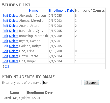Abra la página Students.aspx y, en el control StudentsGridView, reemplace los elementos Nombre y Fecha de inscripciónTemplateField por el marcado siguiente: