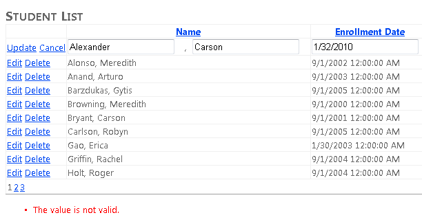 Por ahora, observe que los datos dinámicos proporcionan automáticamente la validación básica de los datos. Por ejemplo, haga clic en Editar, borre el campo de fecha, haga clic en Actualizar y verá que los datos dinámicos hacen que este campo sea obligatorio porque el valor no admite valores NULL en el modelo de datos. La página muestra un asterisco después del campo y un mensaje de error en el control ValidationSummary:
