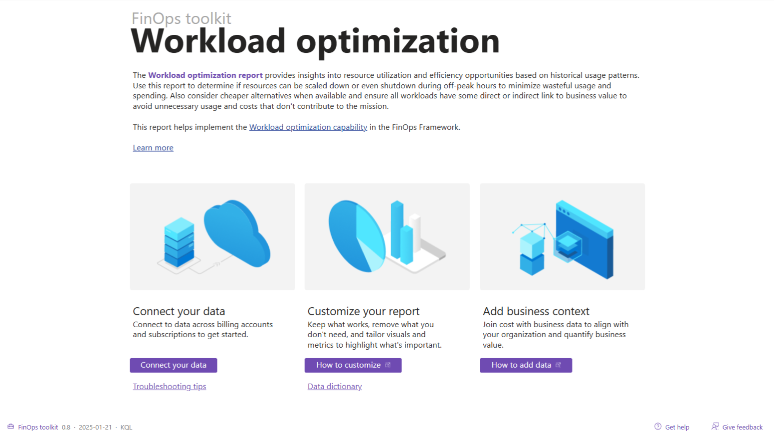 El informe de optimización de cargas de trabajo es nuevo y sigue en desarrollo. Seguiremos ampliando las funcionalidades de cada versión en consonancia con el libro Optimización de costos. Para solicitar otras funcionalidades, cree una solicitud de característica en GitHub.