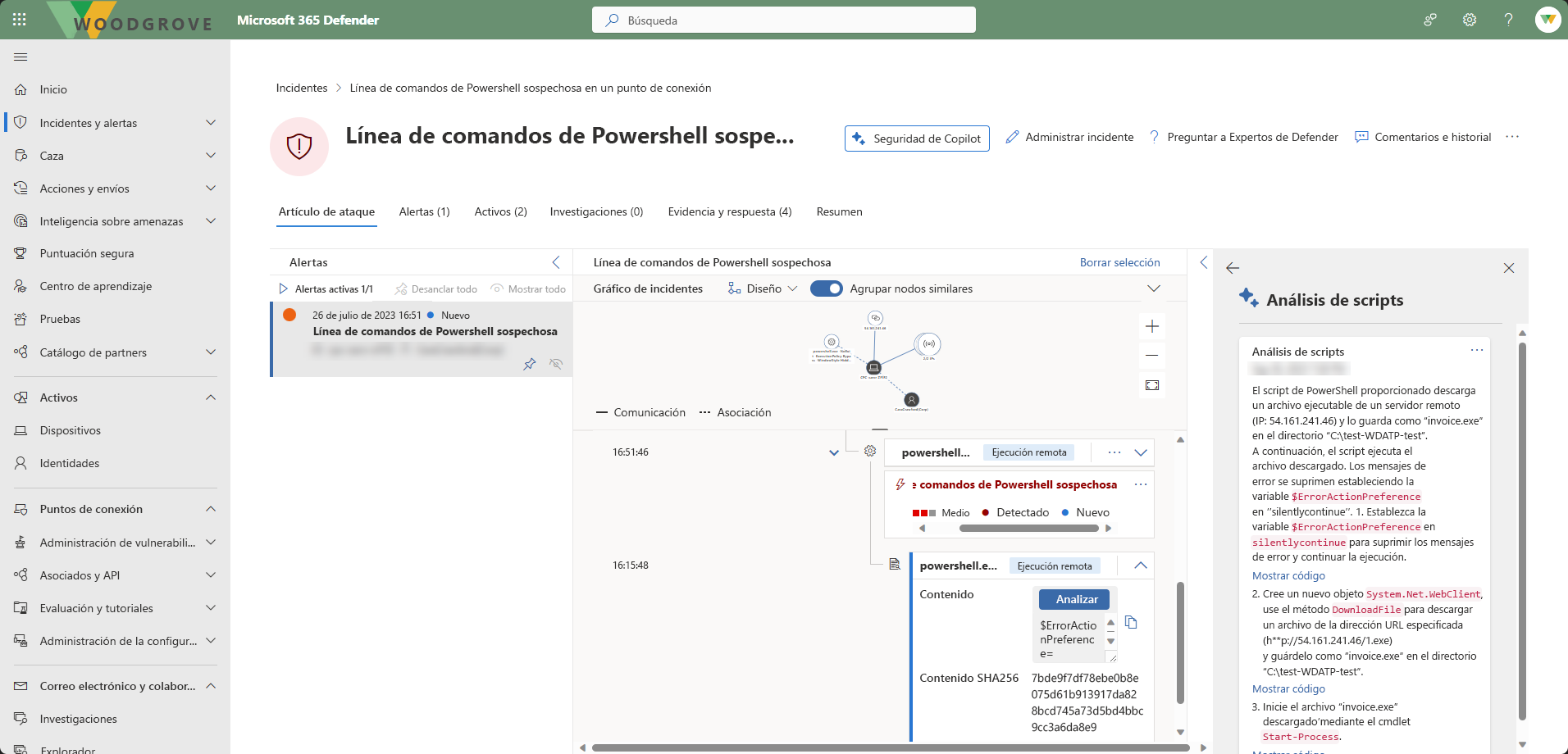 Microsoft Defender XDR marca cuando se ejecuta un script sospechoso. Use Security Copilot para explicar lo que está haciendo el script sospechoso.