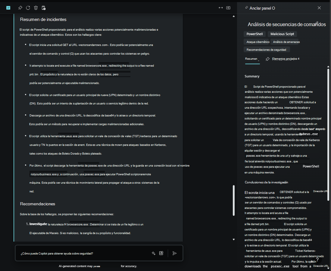 En este caso de uso, Security Copilot ayudó a realizar una investigación exhaustiva de un incidente. Con el lenguaje natural, los analistas pueden obtener una explicación de lo que está haciendo el script sospechoso y comprobar que los indicadores del script están asociados a actores de amenazas conocidos.
