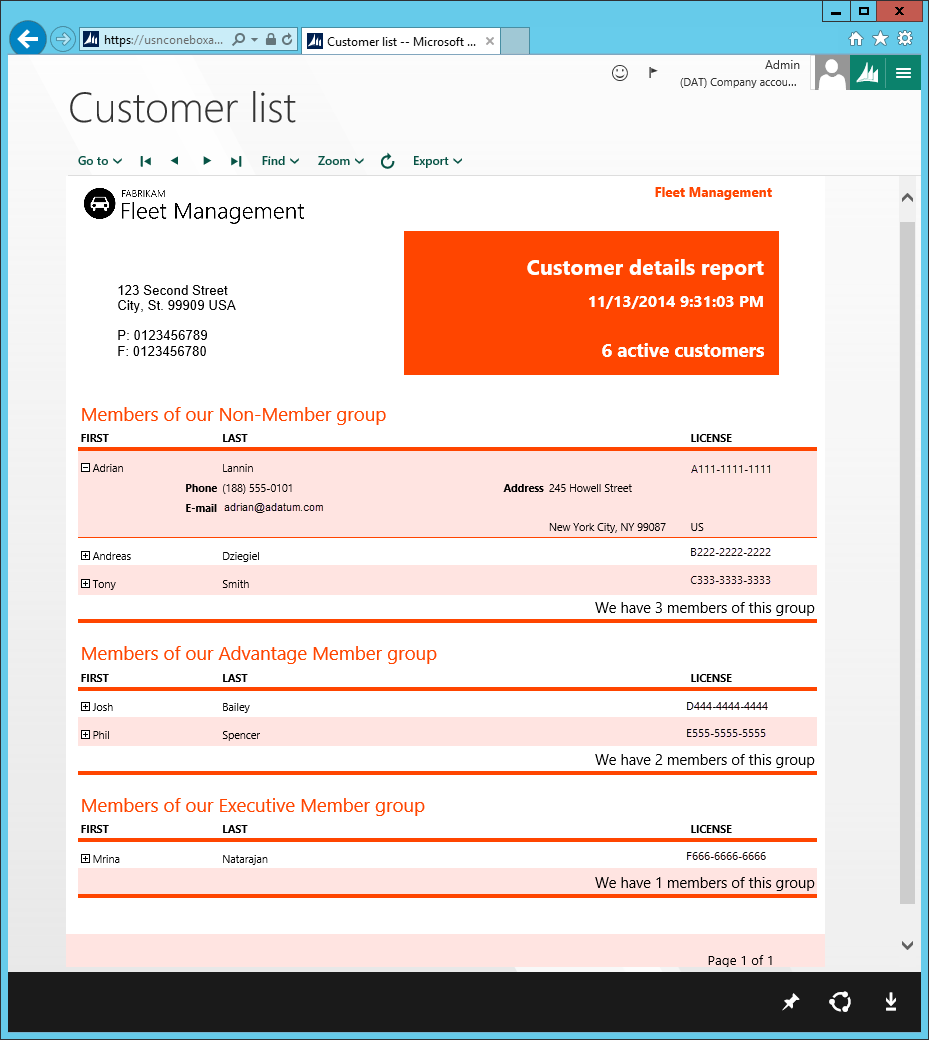 The enhanced report viewing experience that the solution provides for end users is the same as the report preview experience in Microsoft Visual Studio. You no longer use a separate design preview in Visual Studio. Instead, just press Ctrl+F5 to build and preview the report in a Microsoft Edge window. The report appears exactly as it would appear in the client. Even the user's parameter experience is the same. The following image shows an example of a report preview that is opened from Visual Studio.