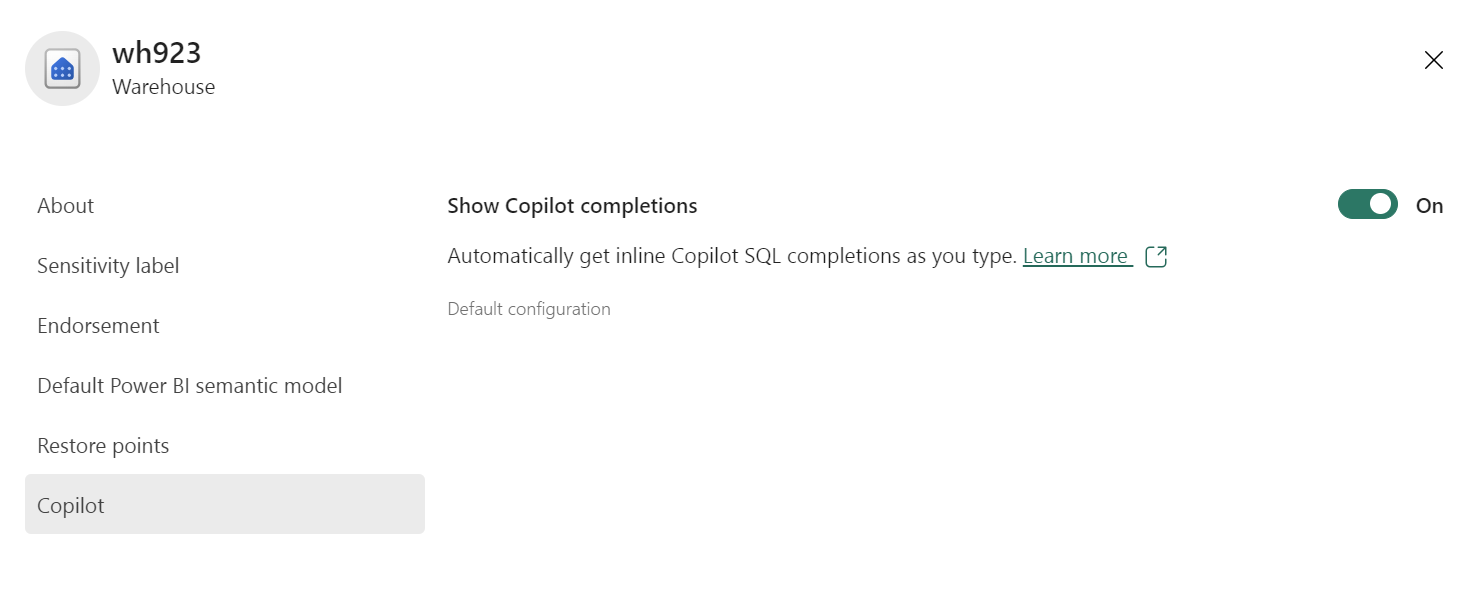 Si no está habilitada, en la configuración del almacén, seleccione el panel Copilot. Habilite la opción Mostrar finalizaciones de Copilot.