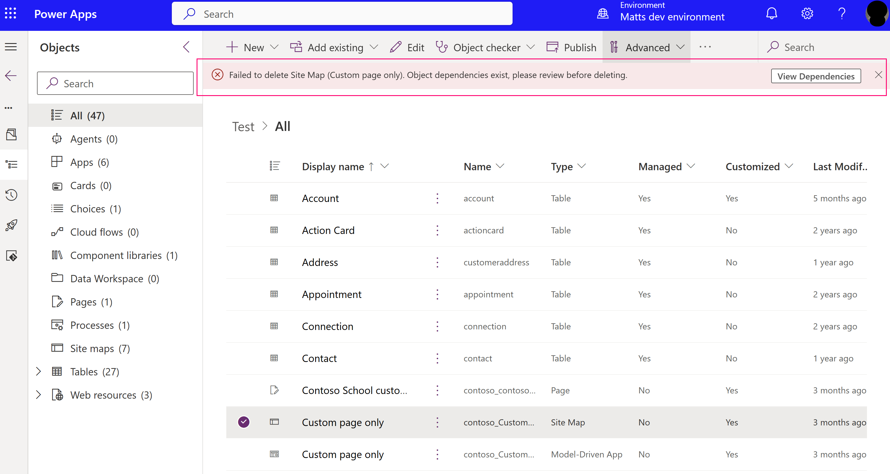 - Intentar desinstalar una solución, lo que hace que la plataforma detecte que existen dependencias.