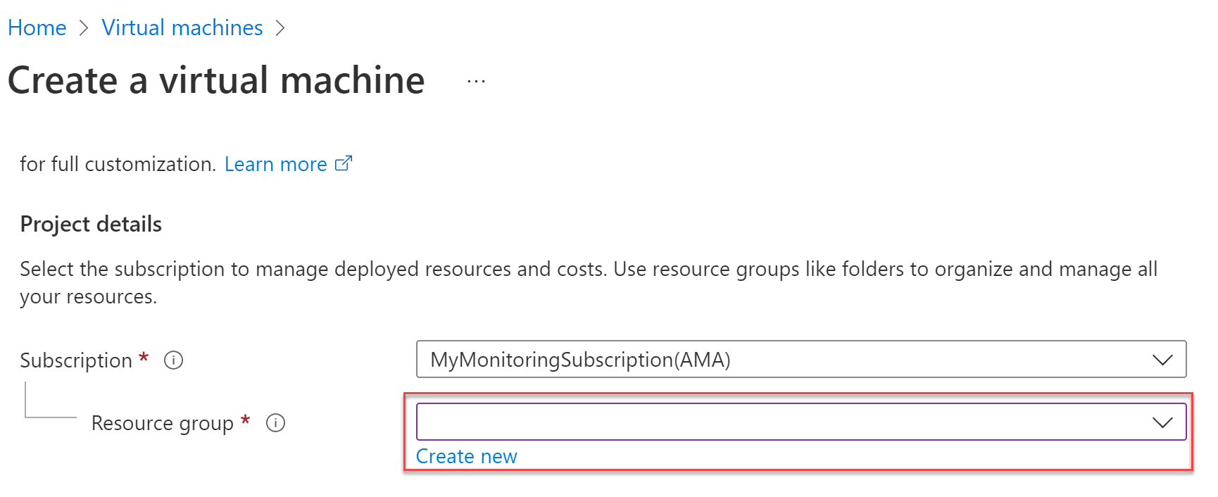 Asigne una máquina virtual a un grupo de recursos cuando cree por primera vez la máquina virtual, como se muestra aquí.