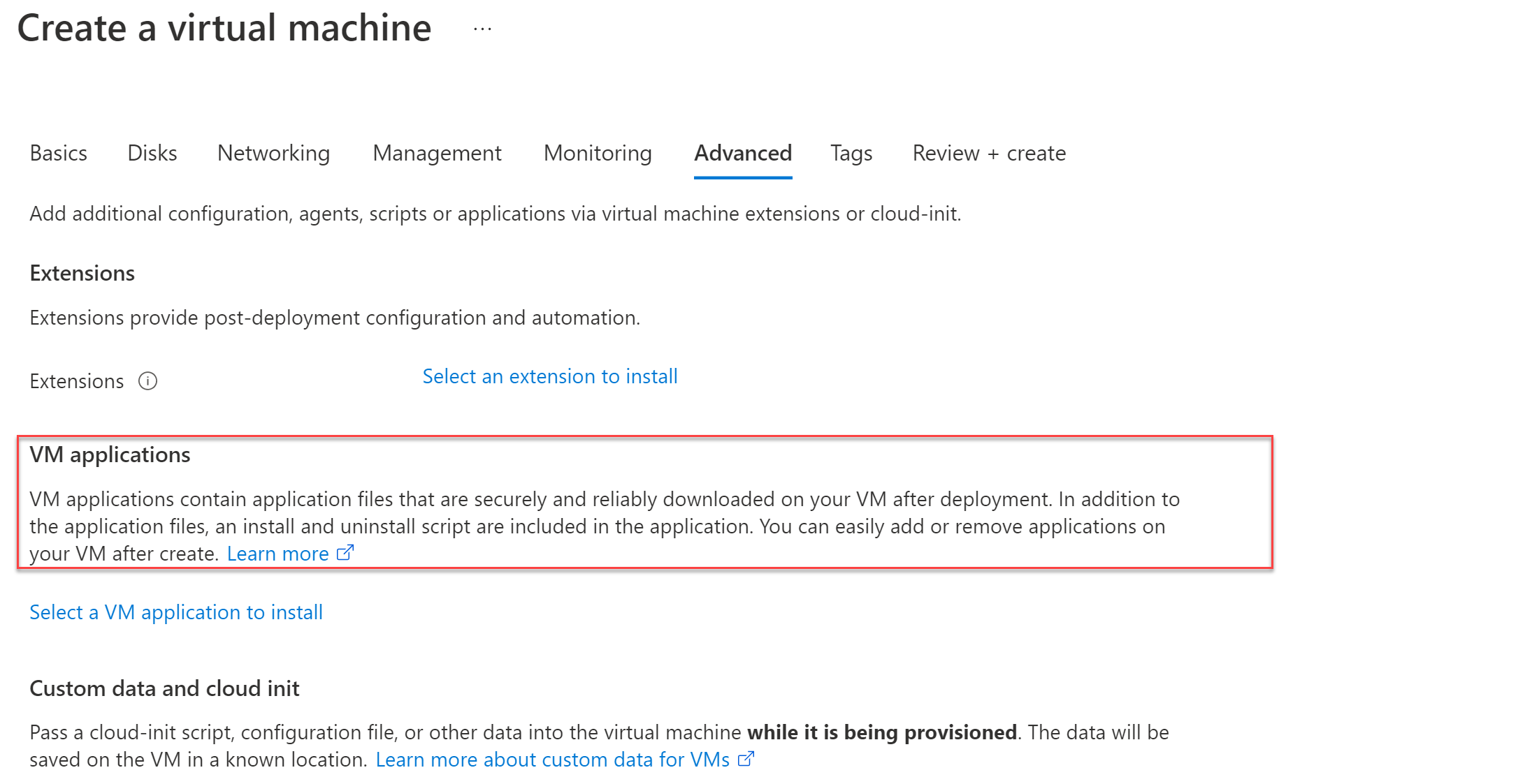 Seleccione las aplicaciones de máquina virtual en la hoja Opciones avanzadas para la configuración de la máquina virtual, como se muestra aquí.
