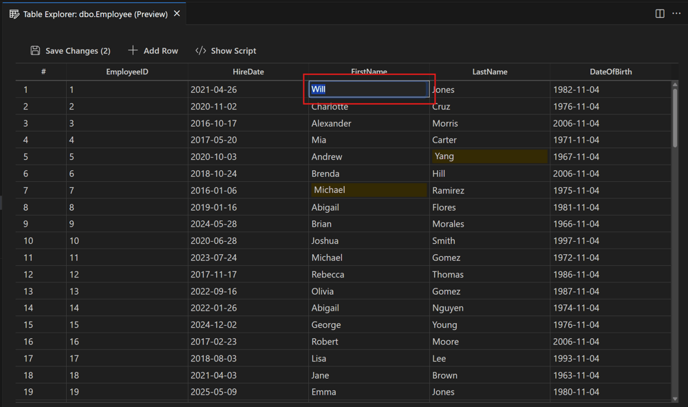 Mostrar script: este panel muestra un script DML de solo lectura que refleja todas las acciones realizadas en la cuadrícula de datos en tiempo real. Esto le permite revisar las operaciones DML subyacentes antes de guardar los cambios.