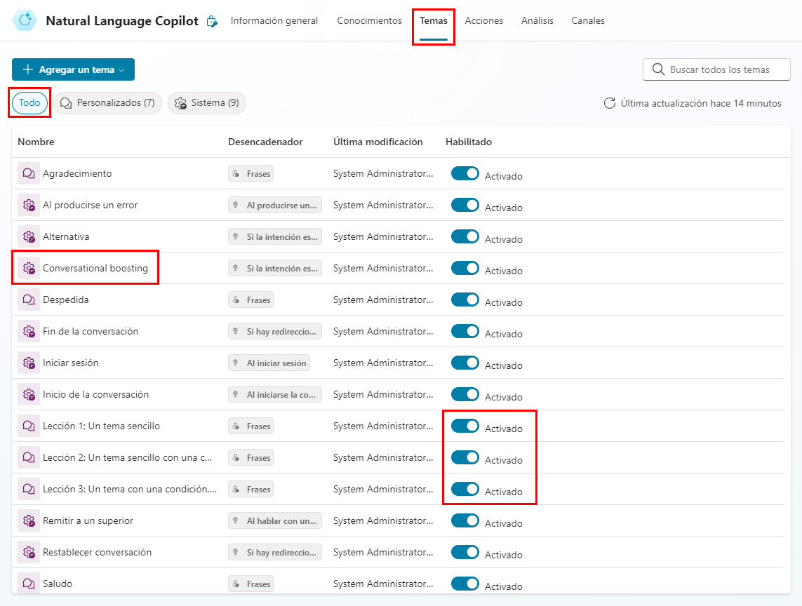 Luego, seleccione la pestaña Temas, elija Todos y abra el tema Acelerador de conversación.