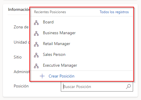 Para agregar un usuario a un puesto en particular de la jerarquía de puestos, seleccione el campo de búsqueda Puesto en el formulario del registro de usuario. Aparecerán los puestos existentes en la jerarquía de su organización y podrá buscar puestos con el campo de búsqueda.