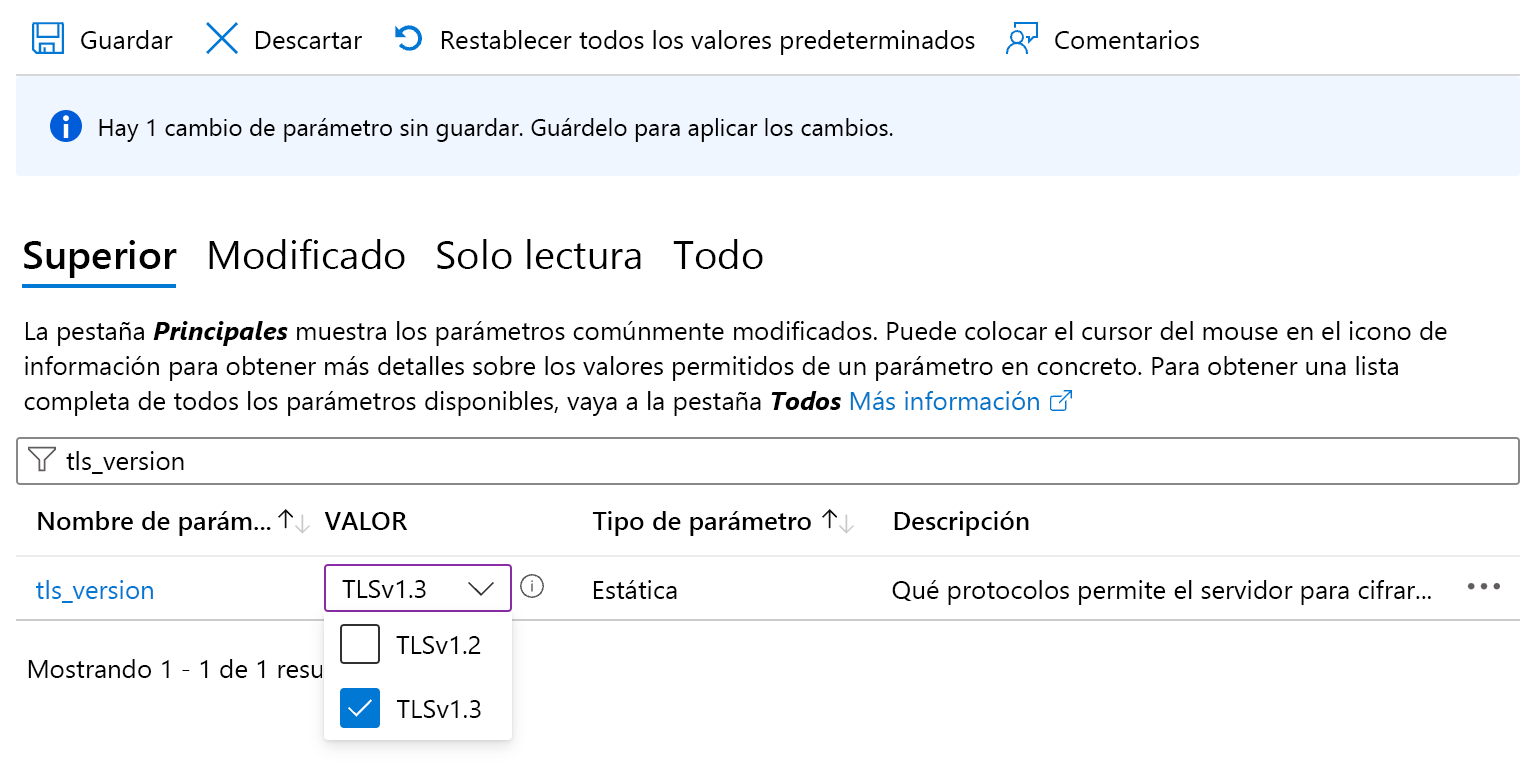 De forma predeterminada, los servidores flexibles de MySQL solo aceptan conexiones cifradas mediante la versión 1.2 de TLS (Seguridad de la capa de transporte). Si está desarrollando nuevas aplicaciones que admiten TLS 1.3, se recomienda admitir o incluso aplicar la versión más reciente. Para ello, lleve a cabo los siguientes pasos: