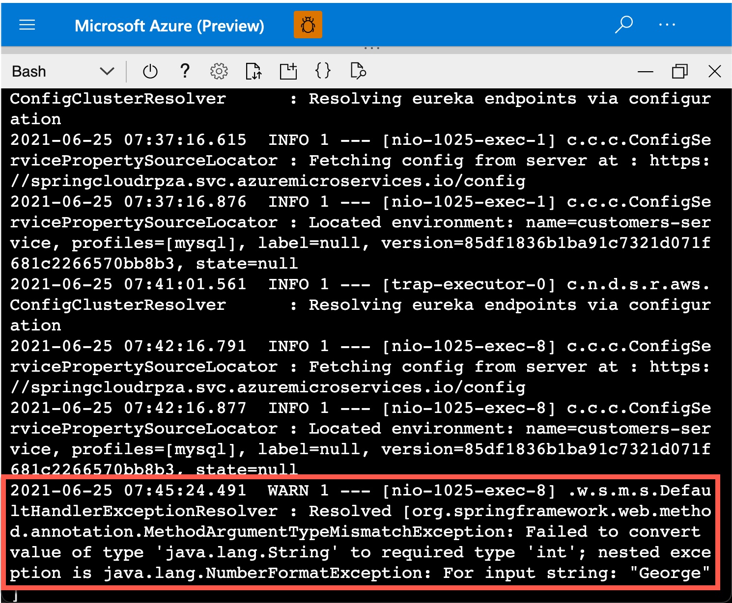 customers-servicey siga los registros:az spring app logs --name customers-service -fA continuación, en un explorador web, abra una nueva ventana y desencadene una advertencia con el comando siguiente (reemplace el comando "<spring-apps-name>" con el nombre de su instancia de aplicaciones de spring):