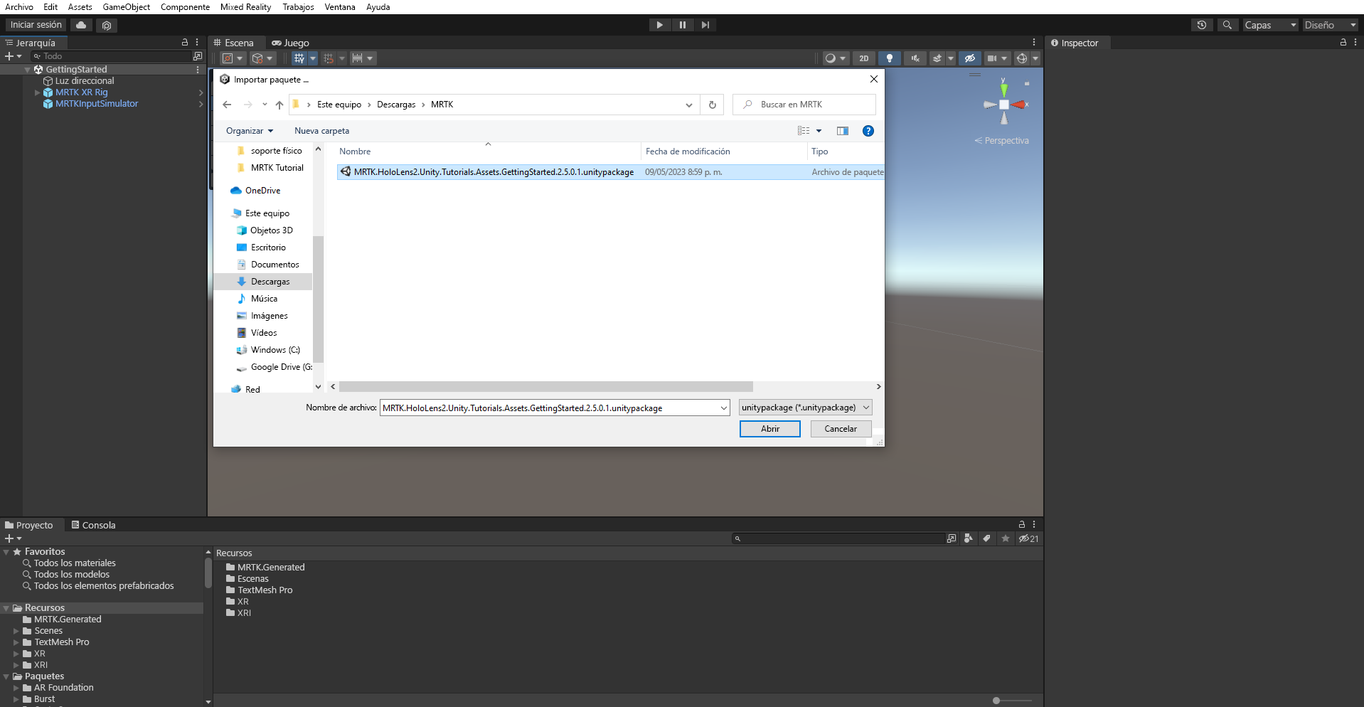 En Importar paquete, seleccione MRTK. HoloLens2.Unity.Tutorials.Assets.GettingStarted.3.0.0 unitypackage que descargó y, a continuación, seleccione Abrir.