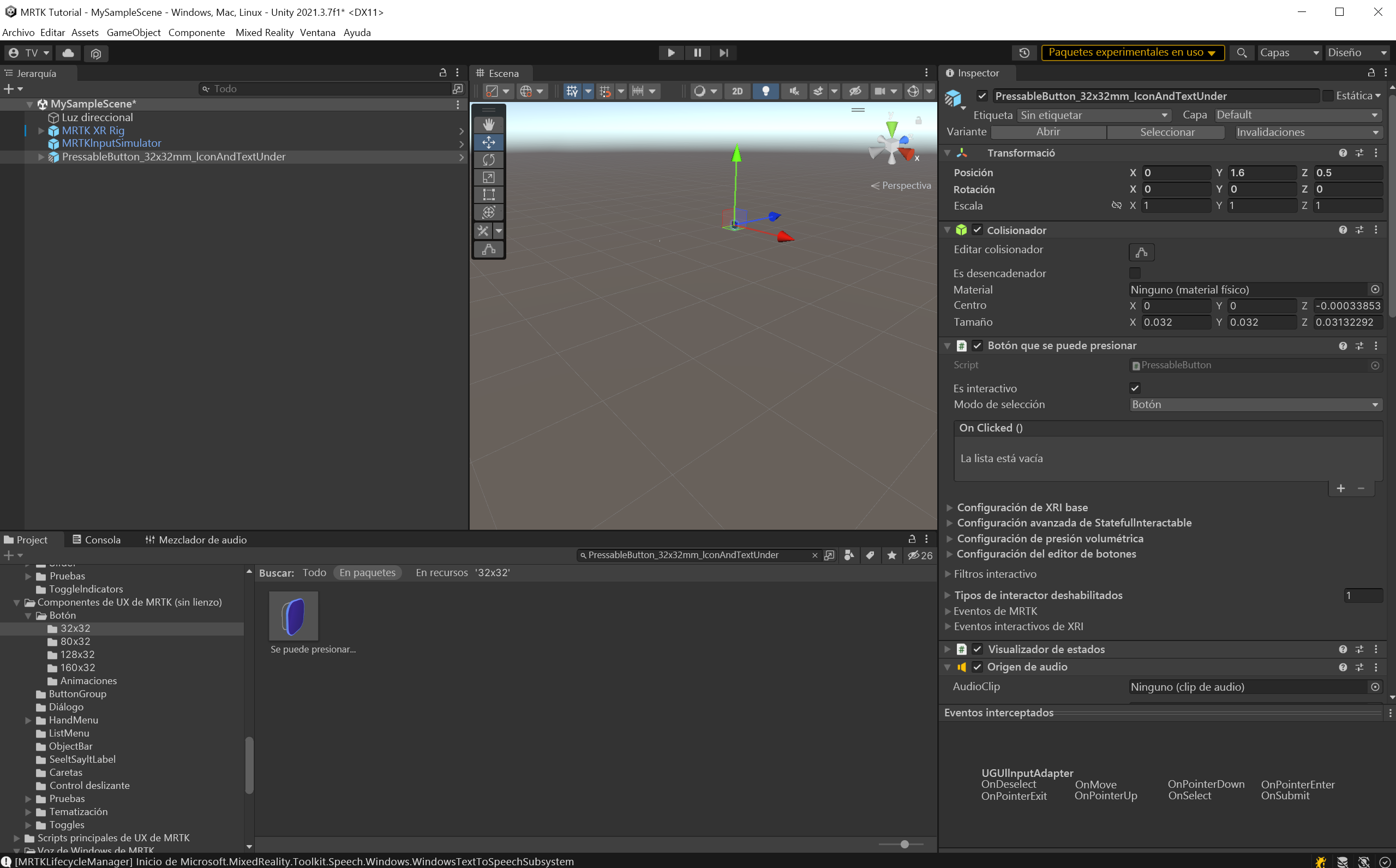 Para probar el audio espacializado en el editor de Unity, debe agregar un clip de audio en el componente Origen de audio con la opción Bucle activada en PressableButton_32x32mm_IconAndTextUnder objeto.