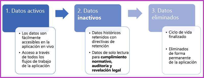 | Datos inactivos | Los datos son inmutables y de solo lectura. Se guardan con una retención a largo plazo. Tienen un acceso limitado. Se retienen por motivos de cumplimiento normativo, auditoría y revelación legal. |
