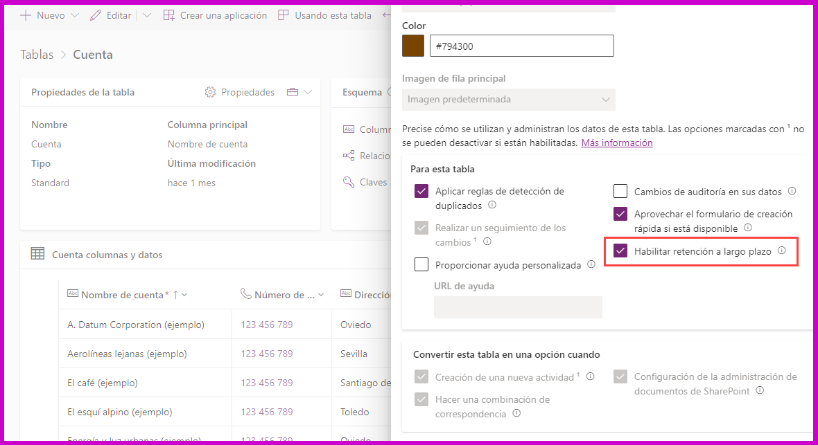 Primero, debe habilitar la retención de datos a largo plazo en las propiedades de una tabla en Power Apps Maker Portal.