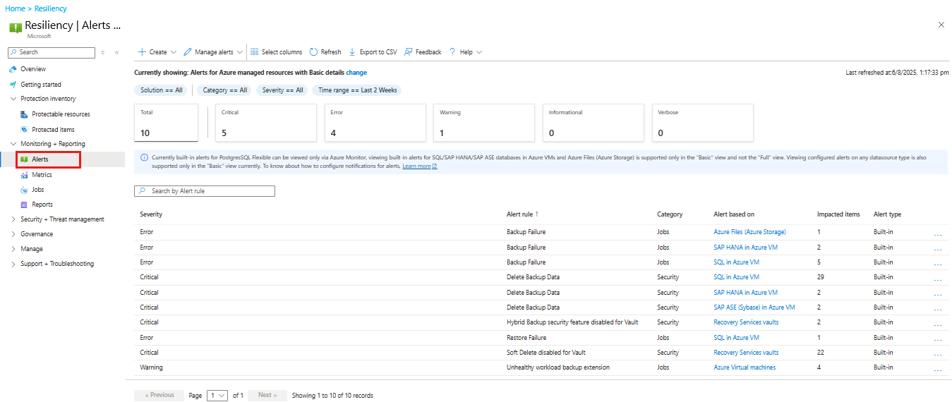 Dans le portail Azure, accédez à Résilience, sélectionnez Surveillance + Alertes de création de rapports>.