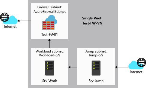 Dans le cadre de cet article, vous créez un seul réseau virtuel simplifié avec trois sous-réseaux pour un déploiement facile. Pour les déploiements de production, l’utilisation d’un modèle Hub and Spoke est recommandée. Le pare-feu se trouve dans son propre réseau virtuel. Les serveurs de la charge de travail se trouvent dans des réseaux virtuels appairés dans la même région avec un ou plusieurs sous-réseaux.