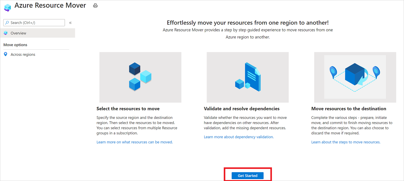 Dans le volet Azure Resource Mover - Vue d’ensemble, sélectionnez Move across regions (Déplacer d’une région à une autre).