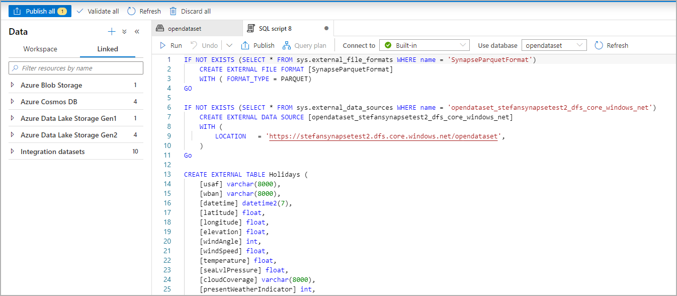 Capture d’écran du portail Azure d’un script T-SQL qui crée une table externe.