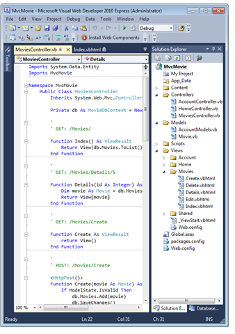 Ouvrez le fichier Controllers\MoviesController.vb et examinez la méthode générée Index . Une partie du contrôleur de film avec la Index méthode est illustrée ci-dessous.