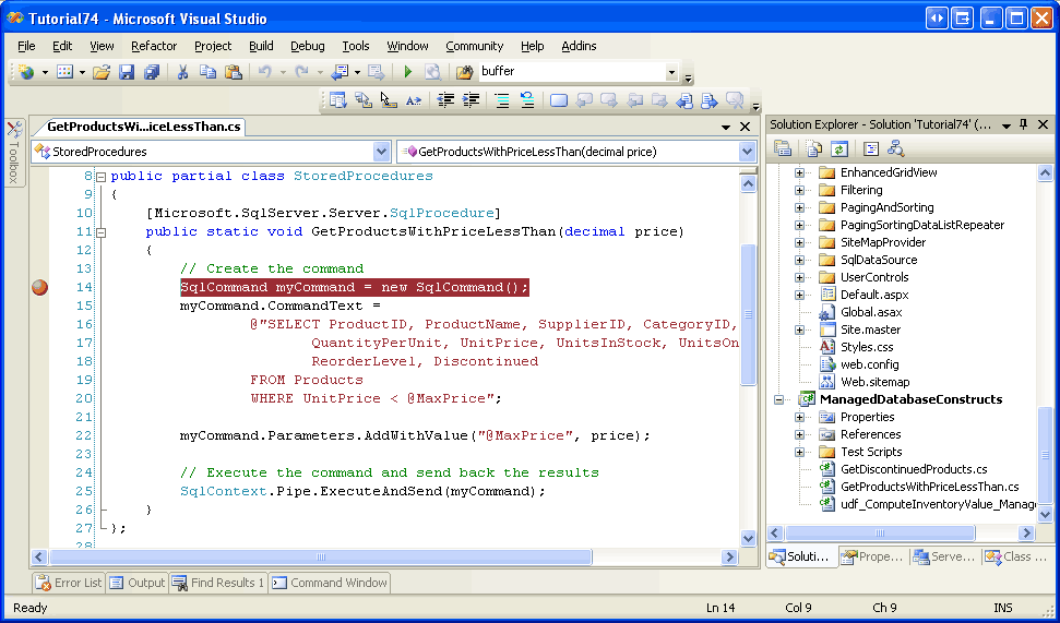 Au lieu de compiler le GetProductsWithPriceGreaterThan.cs fichier de classe à partir de la ligne de commande, vous pouvez également utiliser Visual C# Express Edition ou créer un projet de bibliothèque de classes distinct dans Visual Studio Standard Edition. S ren Jacob Lauritsen a fourni un tel projet Visual C# Express Edition avec du code pour la GetProductsWithPriceGreaterThan procédure stockée et les deux procédures stockées gérées et UDF créés aux étapes 3, 5 et 10. Le projet S ren inclut également les commandes T-SQL nécessaires pour ajouter les objets de base de données correspondants.