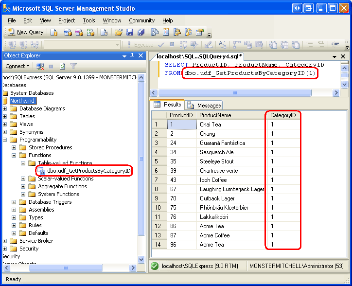 Les bases de données telles que Microsoft SQL Server 2005 utilisent l’langage SQL Transact-langage SQL (T-SQL) pour l’insertion, la modification et la récupération de données. La plupart des systèmes de base de données incluent des constructions pour regrouper une série d’instructions SQL qui peuvent ensuite être exécutées en tant qu’unité unique et réutilisable. Les procédures stockées sont un exemple. Une autre est les fonctions définies par l’utilisateur (UDF), une construction que nous examinerons plus en détail à l’étape 9.