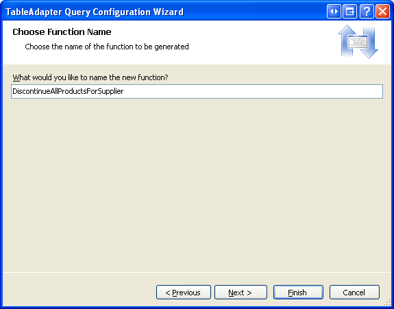 Après avoir entré cette requête et cliqué sur Suivant, le dernier écran de l’Assistant demande l’utilisation DiscontinueAllProductsForSupplierdu nom de la nouvelle méthode. Terminez l’Assistant en cliquant sur le bouton Terminer. Lorsque vous revenez au Concepteur DataSet, vous devriez voir une nouvelle méthode dans le ProductsTableAdapter nom DiscontinueAllProductsForSupplier(@SupplierID).