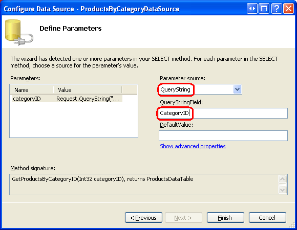 La dernière étape de l’Assistant Configurer la source de données invite une source de paramètre pour categoryID. Étant donné que ces informations sont transmises par le champ CategoryIDquerystring, sélectionnez QueryString dans la liste déroulante et entrez CategoryID dans la zone de texte QueryStringField, comme illustré dans la figure 9. Cliquez sur Terminer pour terminer l’Assistant.