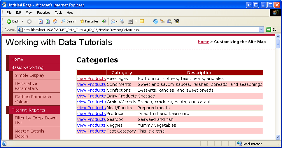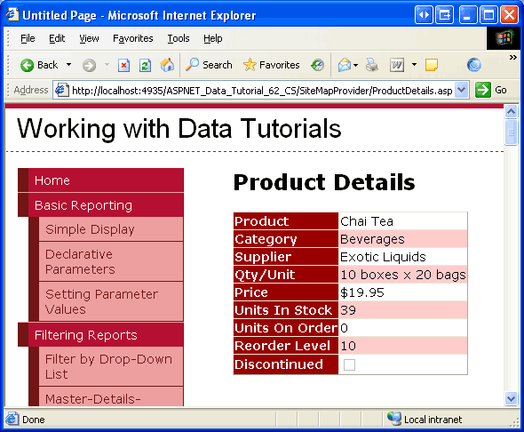 Après la mise à jour Web.config, prenez un moment pour afficher n’importe quelle page des didacticiels dans un navigateur. Notez que l’interface de navigation à gauche affiche toujours les sections et les didacticiels définis dans Web.sitemap. Cela est dû au fait que nous avons quitté AspNetXmlSiteMapProvider le fournisseur par défaut. Pour créer un élément d’interface utilisateur de navigation qui utilise le NorthwindSiteMapProvider, nous devons spécifier explicitement que le fournisseur de cartes de site Northwind doit être utilisé. Nous verrons comment procéder à l’étape 8.
