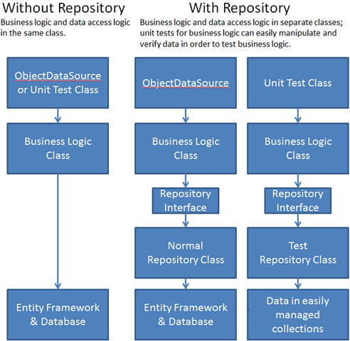 Dans une ObjectDataSource documentation, telle que la vue d’ensemble de la classe ObjectDataSource, le contrôle appelle une classe appelée objet métier qui inclut à la fois la logique métier et la logique d’accès aux données. Dans ce tutoriel, vous allez créer des classes distinctes pour la logique métier et pour la logique d’accès aux données. La classe qui encapsule la logique d’accès aux données est appelée référentiel. La classe de logique métier inclut à la fois des méthodes de logique métier et des méthodes d’accès aux données, mais les méthodes d’accès aux données appellent le référentiel pour effectuer des tâches d’accès aux données.