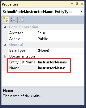 Sous SchoolModel (non SchoolModel.Store), cliquez avec le bouton droit sur vInstructorName et sélectionnez Propriétés. Dans la fenêtre Propriétés , remplacez la propriété Name par « InstructorName » et remplacez la propriété Entity Set Name par « InstructorNames ».