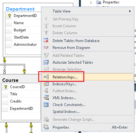 Dans le diagramme de base de données, cliquez avec le bouton droit sur la Department table, puis sélectionnez Relations.