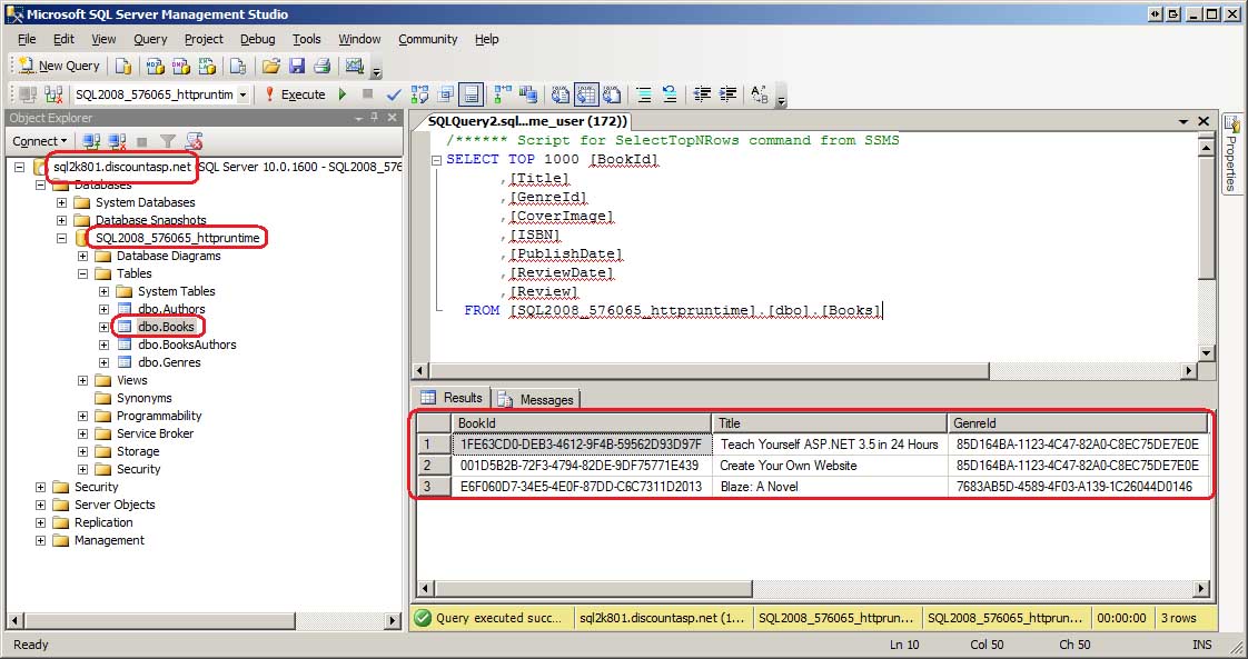 Maintenant que nous avons le script qui contient les commandes SQL pour créer la base de données et ses données, il ne reste plus qu’à exécuter le script sur la base de données de production. Certains fournisseurs d’hôtes web proposent une zone de texte dans leur Panneau de configuration où vous pouvez entrer des commandes SQL à exécuter sur votre base de données. Si vous avez un fichier de script très volumineux, cette option risque de ne pas fonctionner (la taille du REVIEWS.MDF.sql fichier de script est supérieure à 425 Ko, pour instance).