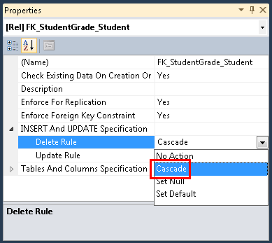 Dans la fenêtre Propriétés , développez INSERT et UPDATE Specification et définissez la propriété DeleteRule sur Cascade.