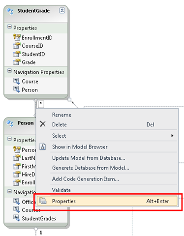 Pour vous assurer que le modèle maintient les entités en mémoire synchronisées avec ce que fait la base de données, vous devez définir des règles correspondantes dans le modèle de données. Ouvrez SchoolModel.edmx, cliquez avec le bouton droit sur la ligne d’association entre Person et StudentGrade, puis sélectionnez Propriétés.