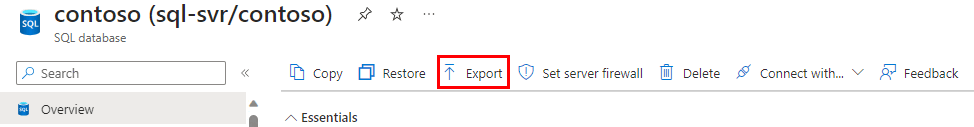 Pour exporter une base de données à l’aide du portail Azure, ouvrez la page de votre base de données, puis cliquez sur Exporter dans la barre d’outils.