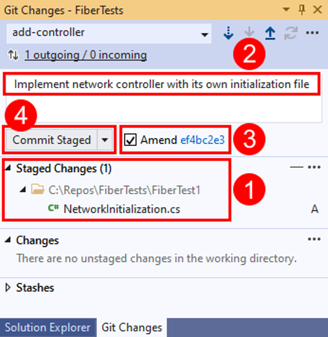 Dans la fenêtre Modifications Git , entrez un message qui décrit vos modifications intermédiaires, puis sélectionnez Commit Staged.