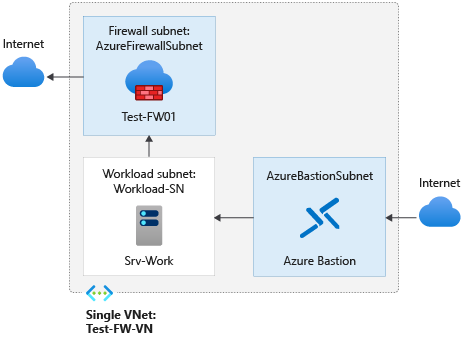 Dans le cadre de cet article, vous créez un seul réseau virtuel simplifié avec trois sous-réseaux pour un déploiement facile. Pour les déploiements de production, un modèle Hub and Spoke, dans lequel le pare-feu est dans son propre réseau virtuel, est recommandé. Les serveurs de la charge de travail se trouvent dans des réseaux virtuels appairés dans la même région avec un ou plusieurs sous-réseaux.