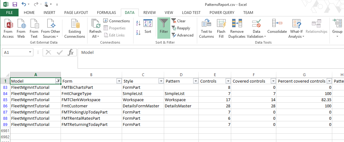 The report shows pattern-related information regarding the forms in this model including the top-level form pattern currently applied, and the percentage of controls on the form covered by patterns. This can be used to track the remaining patterns work in one or more models.