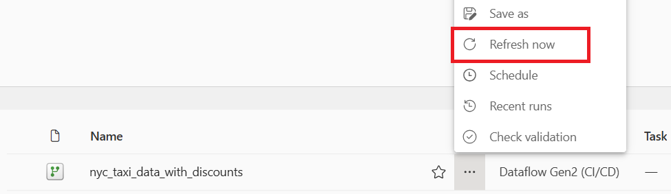 (Facultatif) Dans la page de l’espace de travail, vous pouvez renommer votre dataflow en sélectionnant les points de suspension à droite du nom du flux de données qui s’affiche après avoir sélectionné la ligne, puis en choisissant Paramètres. Dans cet exemple, nous le renommons en nyc_taxi_with_discounts.