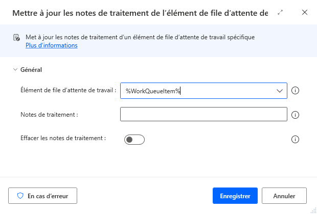 | Notes de traitement | Oui | Texte | Notes de traitement personnalisées ou valeur à ajouter à l’élément de la file d’attente en cours de traitement. | |