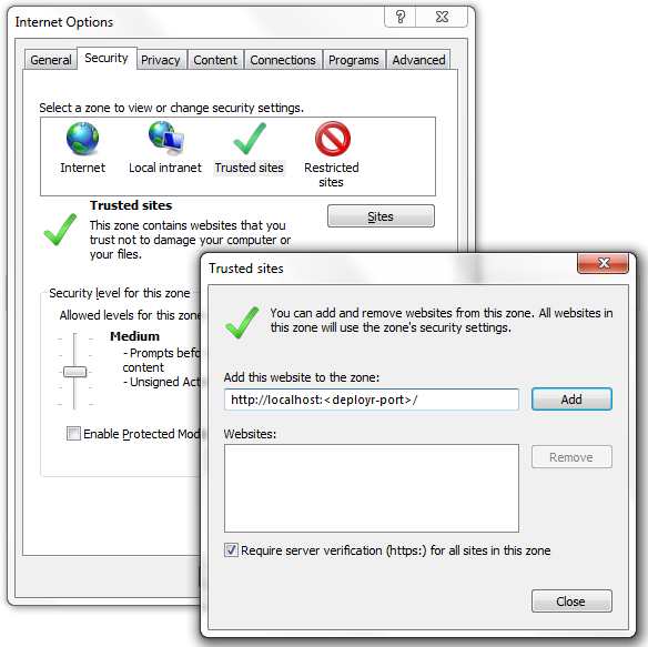 https://localhost:<PORT>/deployrto the Trusted Sites list.In the Connections tab in the same Internet Options dialog box, click LAN settings.