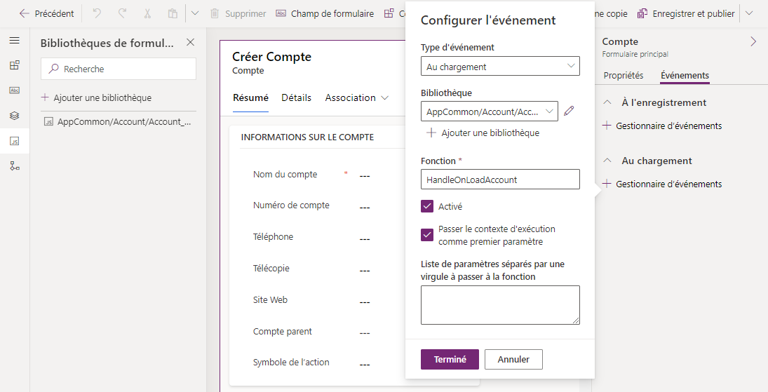 Enregistrez le gestionnaire d’événements OnLoad dans les propriétés du formulaire de compte.