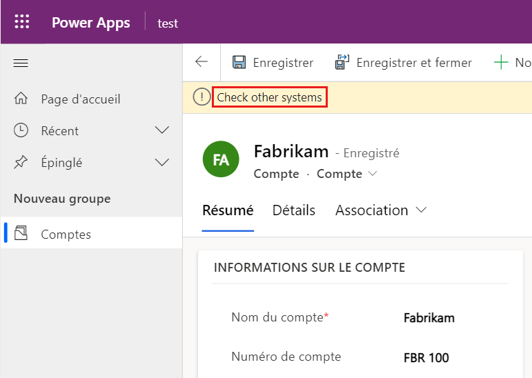 Ce code affiche une notification au niveau du formulaire chaque fois que les données de la colonne de numéro de compte sont modifiées.