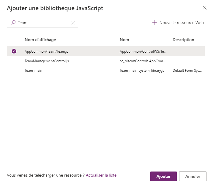 Saisissez team dans la zone de texte Rechercher, puis appuyez sur Entrée. Sélectionnez FormTeamProject.js, puis cliquez sur Ajouter.
